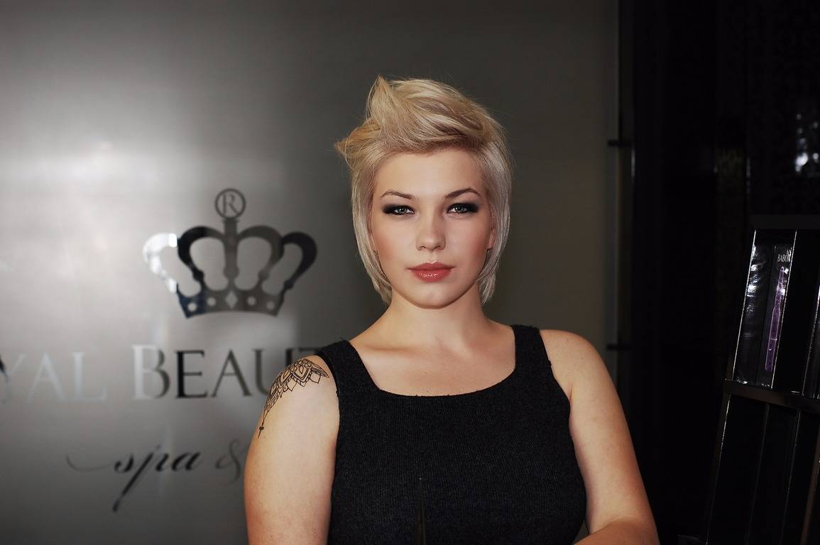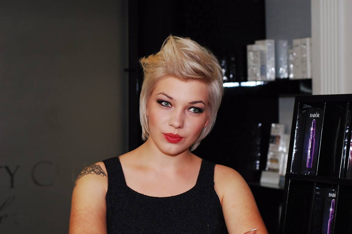 I suggested dying the hair even lighter in order to make the color more contrast and bright, with a cold shade, and it turned out that Anya had wanted to dye her hair that way for a long time but did not go for that broke because of the hair health, but with innovative means of hair care everything is possible now.Then we made a contrast haircut with an elongated upper and lower zone, flat temporal zones, which allows for a variety of modeling, and makeup is also quite bright, because the work takes place in the evening and suggests a good mood.
